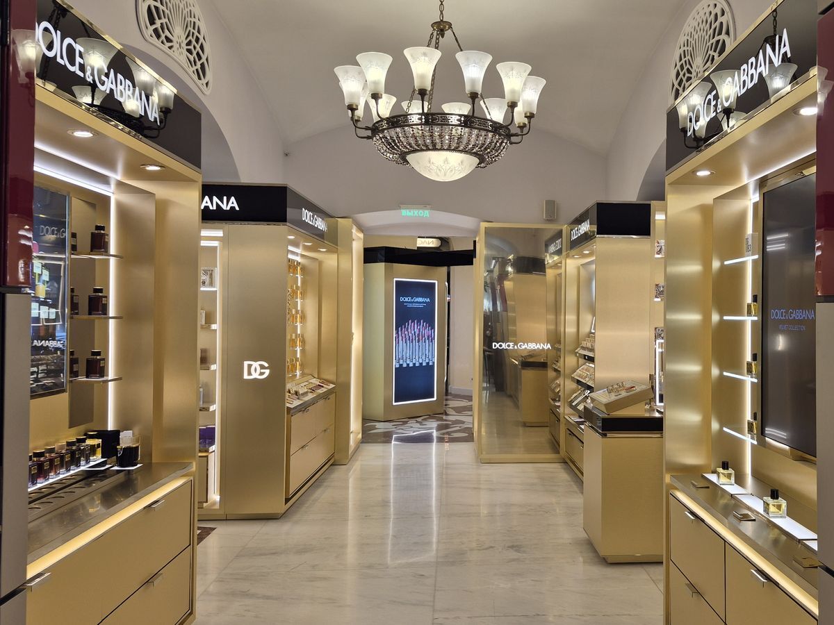 Bespoke furniture for DOLCE GABBANA combined in Articoli store inside GUM takes a great amount of place and creates something similar to boutique with its own entrance area involving video panels and lightboxes.